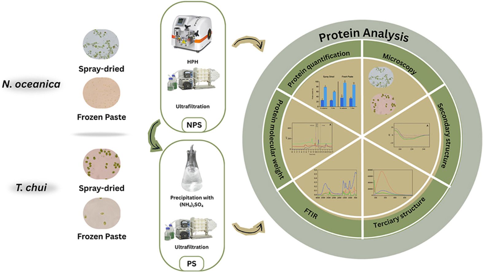 The need for sustainable protein substitutes is being driven by the growing global population. Because of their high protein content and environmental sustainability, microalgae are a viable source. In this study, proteins extracted from frozen paste and spray-dried biomass from Nannochloropsis oceanica and Tetraselmis chui were studied.
